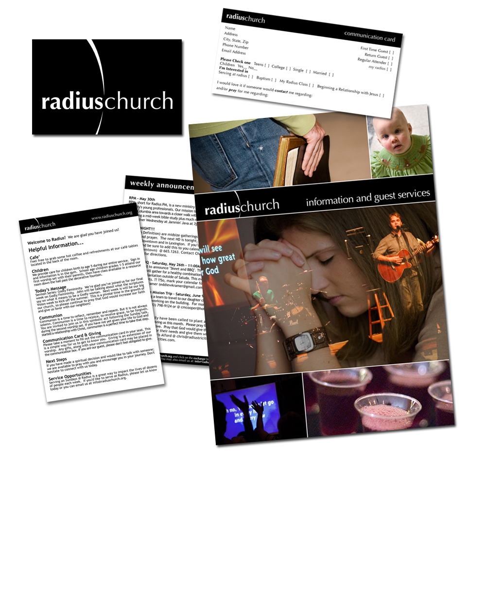 Radius Church needed a new logo, weekly bulletins, guest communication cards, and a sign for their quest services table.