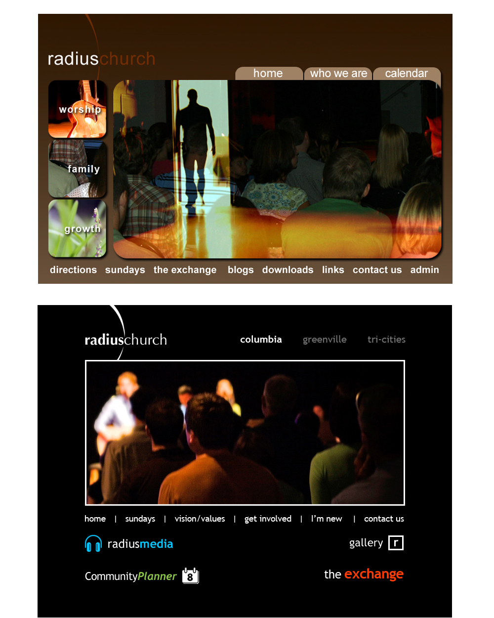 In the early days, Radius felt like a grassroots movement of Christ Followers and the feel of the site was geared toward that feeling. The bottom image or the current site is the new look at feel for a "grown up" Radius Church."